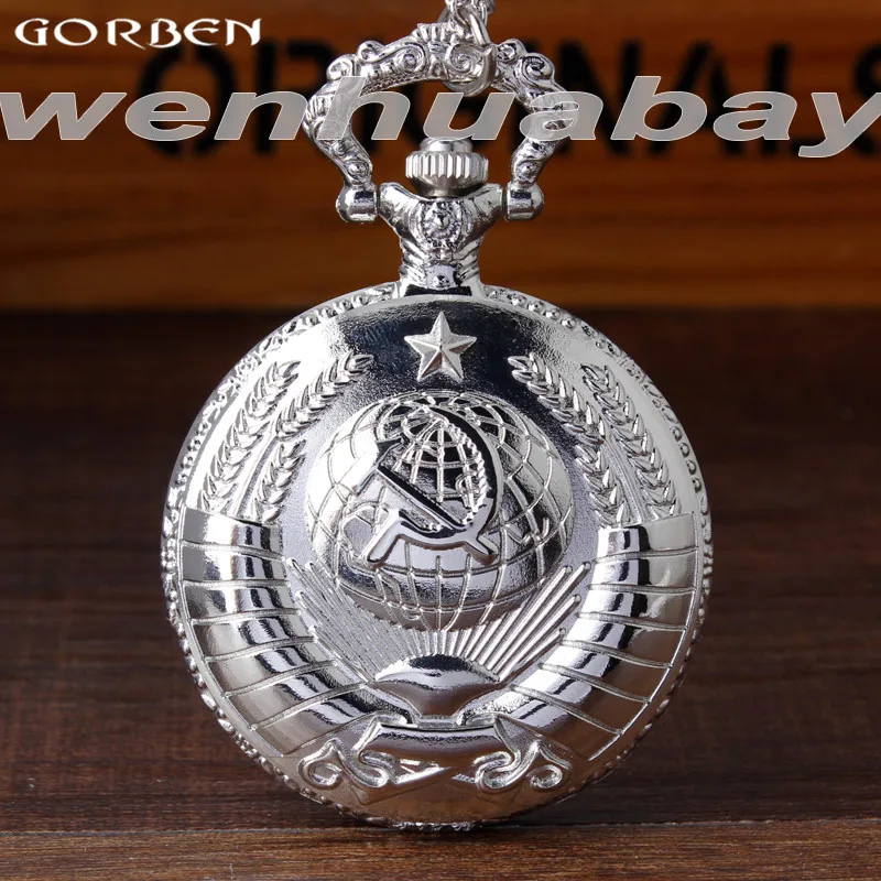 Name: Reloj de bolsillo de cuarzo Vintage plata completa USSR con martillo hoz soviético para el Día de Rusia colgantes con collar de cadena reloj mujeres hombres regalo